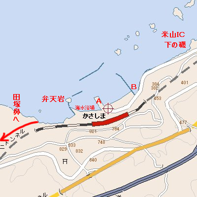 ・笠島漁港はこぢんまりとした漁港で、ここは本格派投げ釣り師向きというよりも、ファミリーなどでチョイ役げやサビキ釣りなどで楽しみたいところ。漁港左側のわずかな砂浜は、海水浴シーズンには多くの客で賑わいを見せる。 ・A付近は広い駐車スペースやトイレもあり、この埠頭周りがファミリーフィッシングの釣り場としてはよいだろう。水面からの高さもあまりなく、釣りよい場所といえる。 ・付近には釣具店などはないようなので、釣具の準備は怠りなく。 ・笠島漁港を海を見て左に歩いていくとトンネルがある。ちょっと勇気を出してこの真っ暗なトンネルを抜けると、田塚鼻(牛ヶ首)の海岸がある。外界から隔絶された不便な地のため打ち上げられたゴミもあるが、探検気分で訪れてみるのも一興かと思う。この海岸で投げ釣りをする場合は、浜の右半分は根があるので、浜の左側半分で釣るとよい。それでも根掛かりの準備は十分に。キスが釣れれば、良型ぞろいだ。