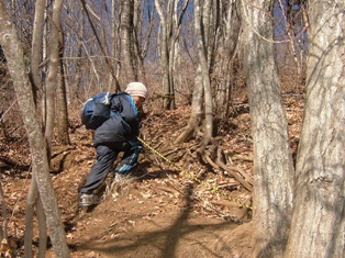 最初は杉や檜の暗い樹林帯を行きますが、徐々に明るくなってきます。 私は長男と一緒に山登りに行くときは、なるべく長男を先に行かせるようにします。私が前になるとどうしても後ろの長男が遅れがちになるのですが、先に行かせるとどういうわけか割としっかり歩いていくのです。